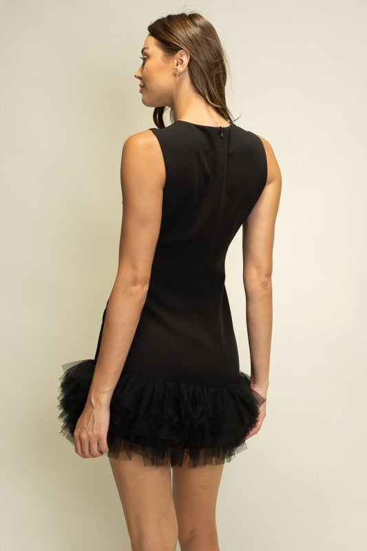 Turn heads this Holiday and New Year season with this bold and flirty sleeveless mini dress — a modern twist on timeless elegance. Designed with a sleek, fitted bodice and a voluminous layered tulle ruffle hem, this dress is perfect for holiday parties, cocktail events, and festive boutique displays. Effortless to style yet full of personality, it’s a must-have statement piece for boutique shoppers looking to stand out this season.