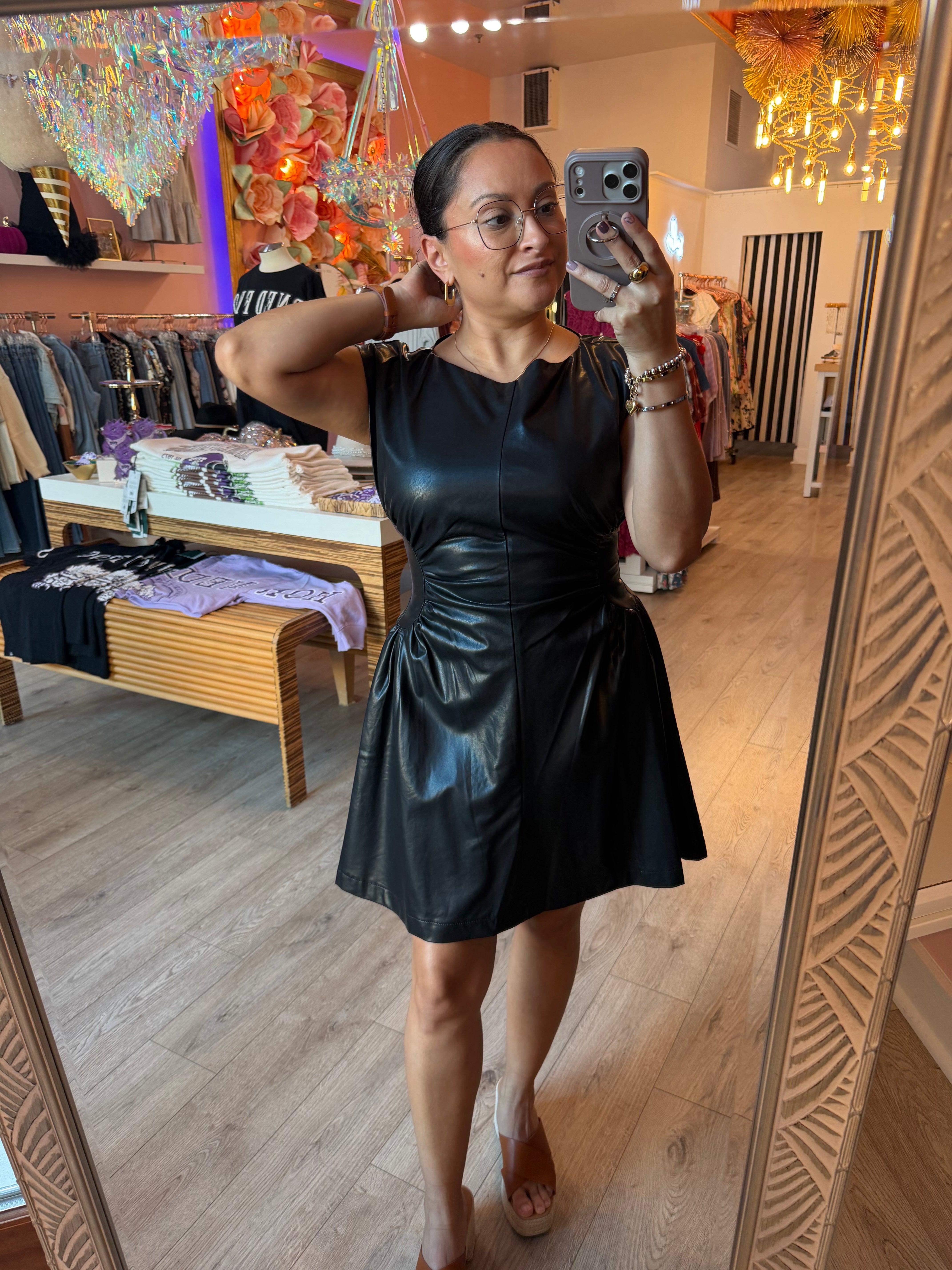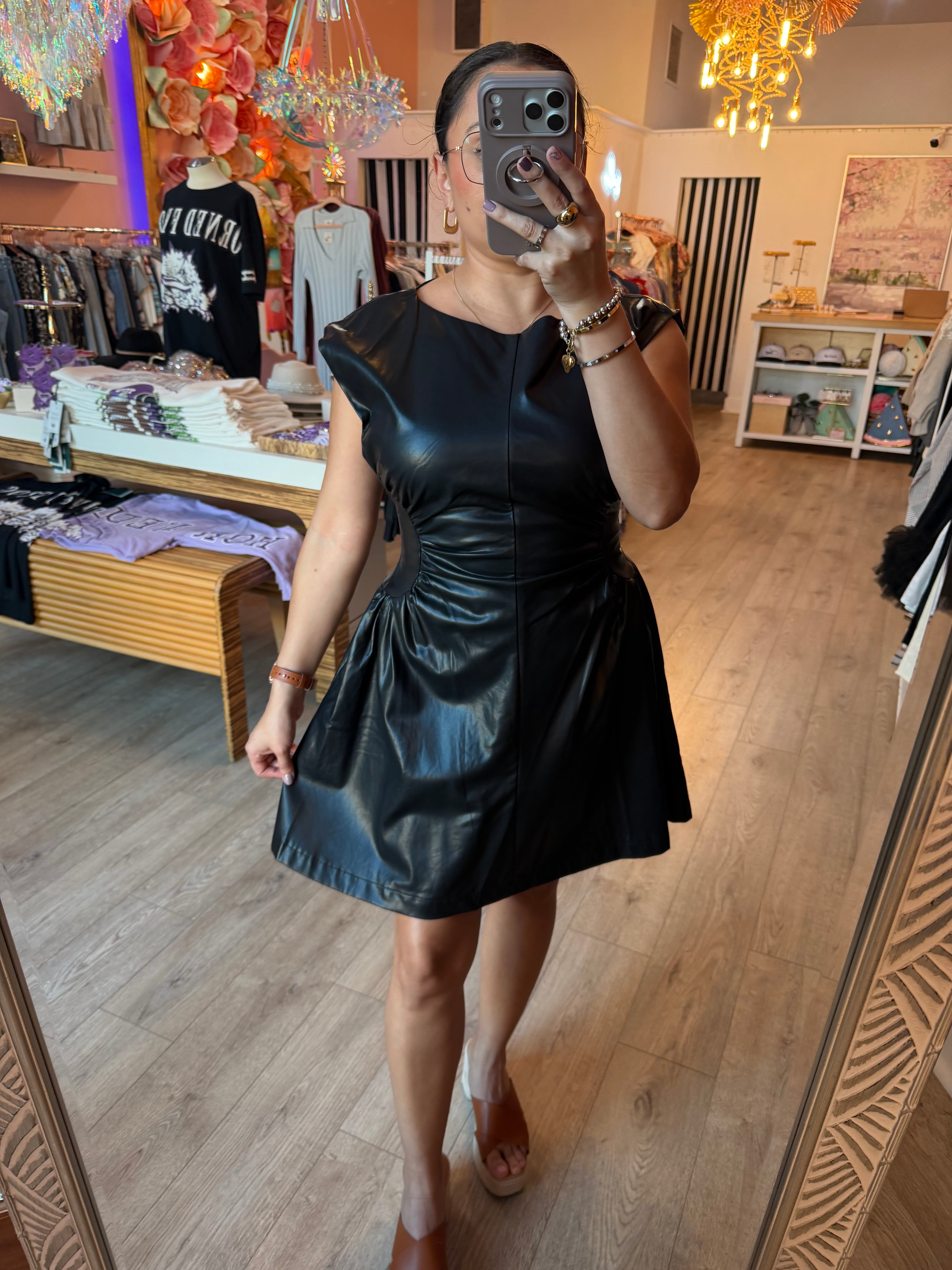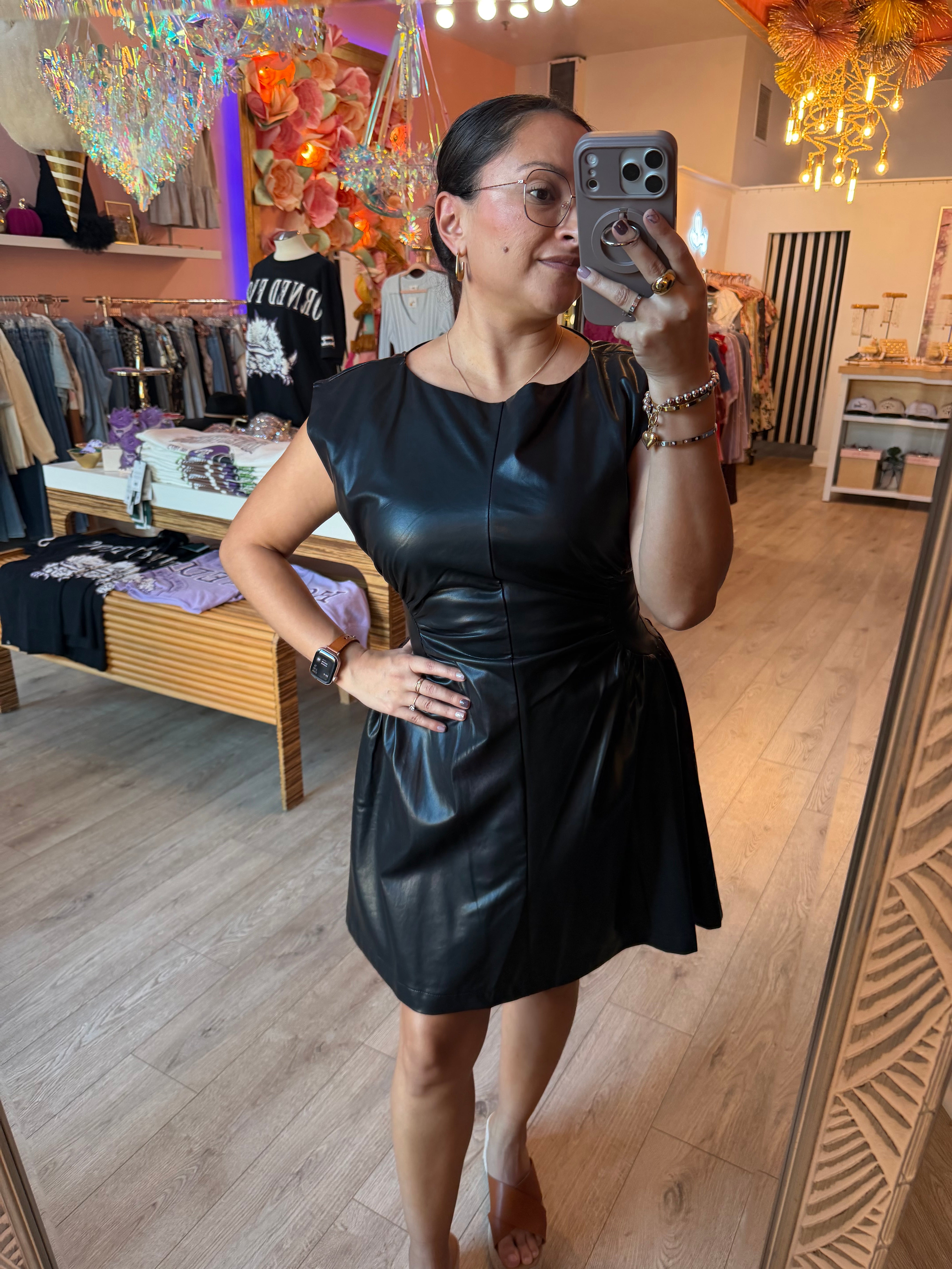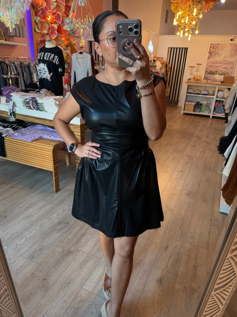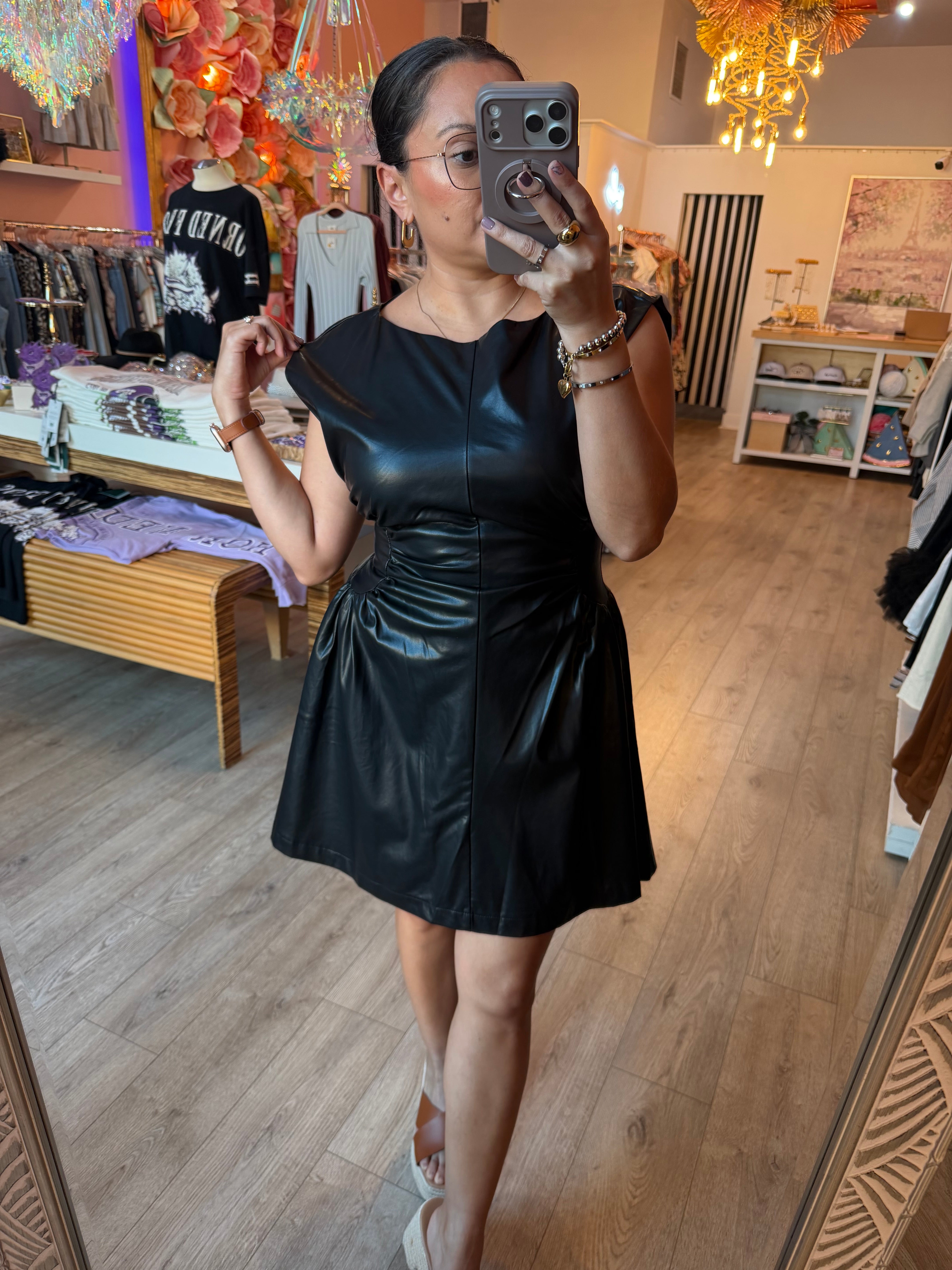 Bold and sleek, this faux leather mini dress features a strong shoulder silhouette, ruched waist detail, and a flattering A-line shape. The structured fit gives it a modern edge, perfect for styling with statement boots or layering under outerwear. A standout piece for the trend-forward customer who loves a confident, fashion-forward look.