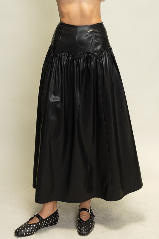 Make a bold statement with this PU midi skirt featuring an eye-catching gathered detail across the waist. The structured waistband flatters the silhouette, while the voluminous skirt adds dramatic flair. Perfect for elevating your fall and winter collections with a touch of edgy sophistication.